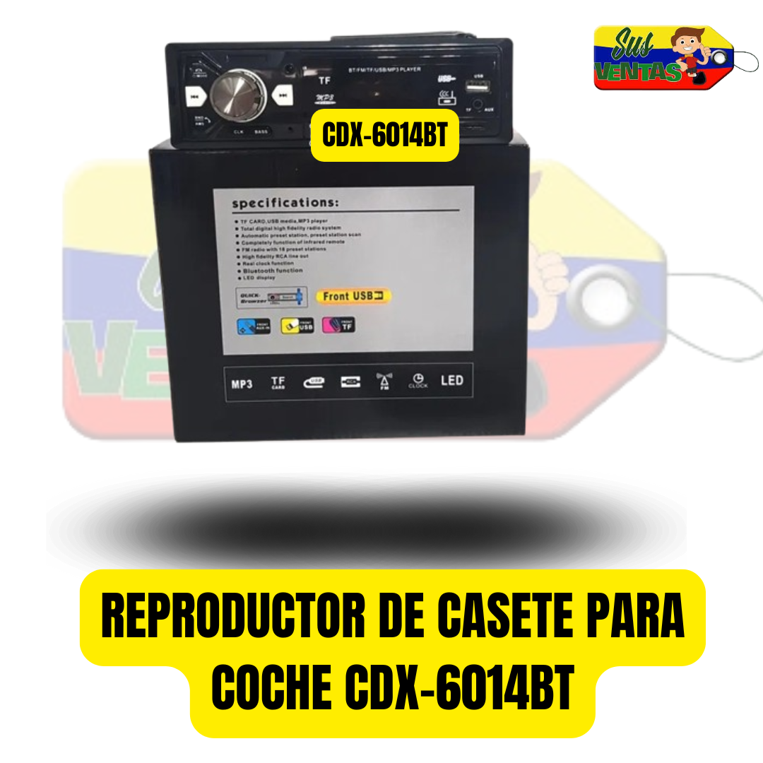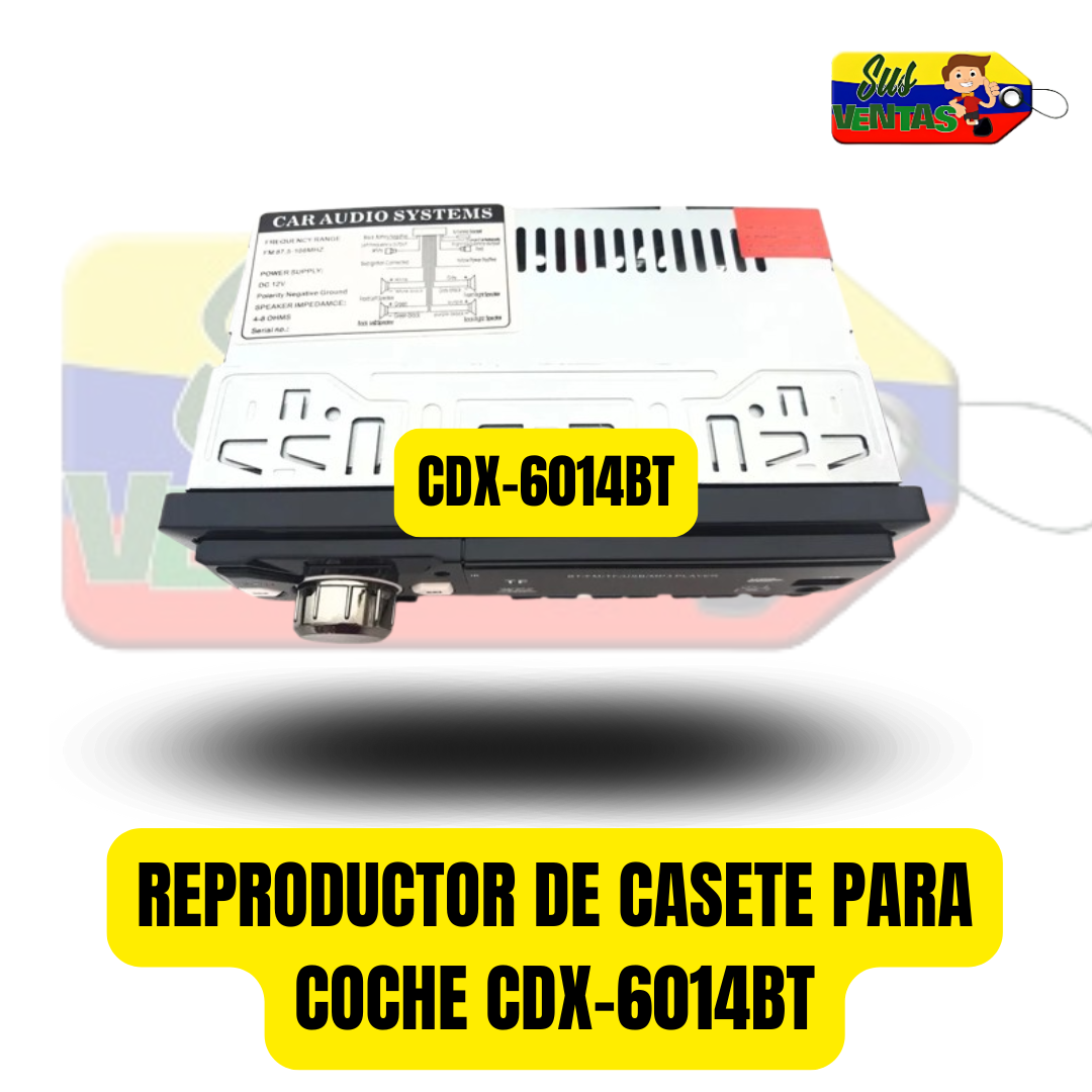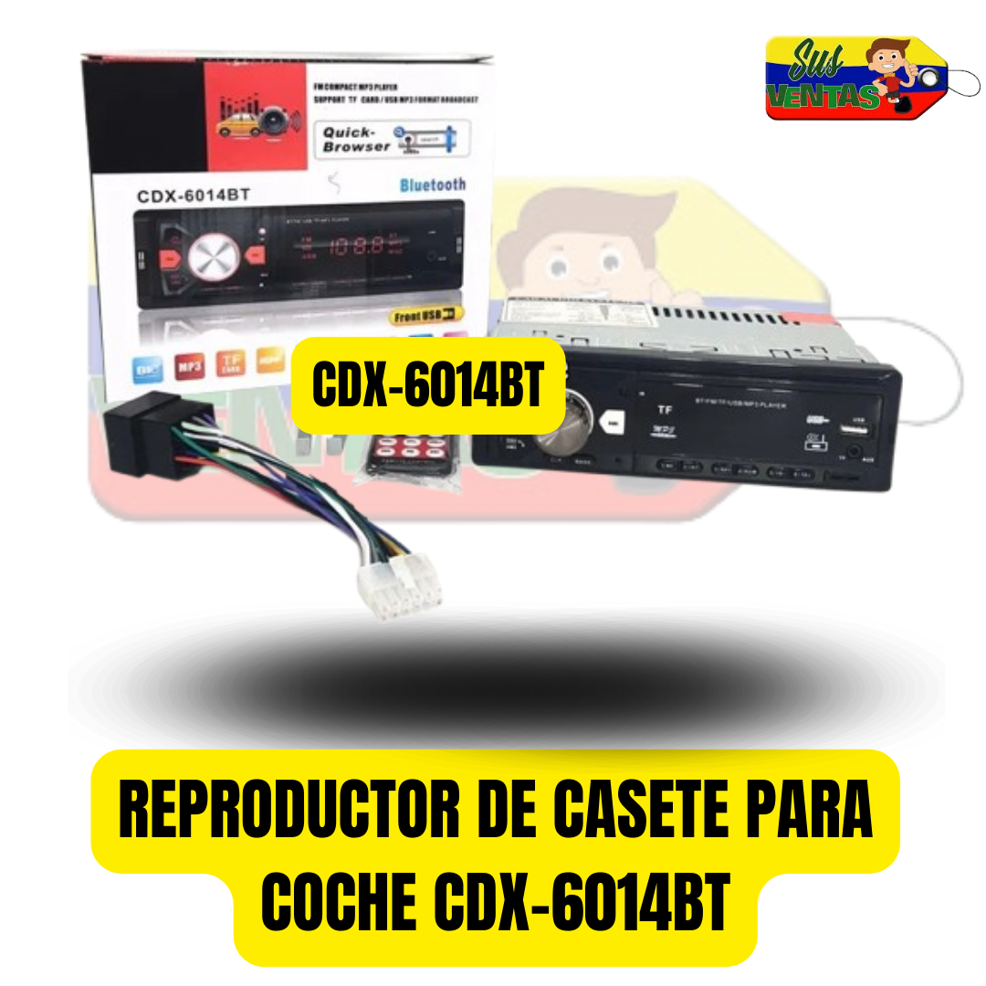 Reproductor de casete para coche CDX-6014BT, reproductor MP3 con Bluetooth, tarjeta TF y USB Reproductor de casete Bluetooth para coche CDX Bluetooth, reproductor de MP3, puerto USB Especificaciones: - TARJETA TF, soporte USB, reproductor MP3 - Sistema de radio digital de alta fidelidad - Estado preestablecido automático, exploración de estaciones preestablecidas - Control remoto infrarrojo con todas las funciones - Radio FM con 18 estaciones preestablecidas - Entrada de línea RCA de alta fidelidad - Función de reloj real - Función Bluetooth - Pantalla LED - Potencia de salida máxima 25Wx4